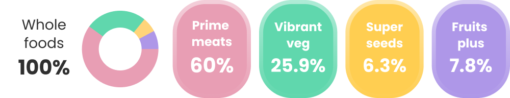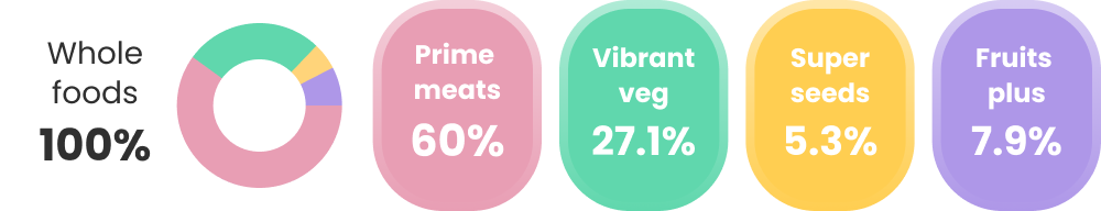60% human quality meats, wholefoods, vibrant vegetables, seeds, fruits, herbs and essential oils.