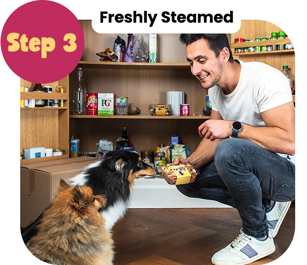 We’ve done all the hard work – no cooking needed! Your dog’s food arrives fully cooked, pre-portioned and ready to enjoy straight from the tray. And thanks to our fresh steam cooking process, you can store it in your pantry or kitchen cupboards, freeing up fridge space.