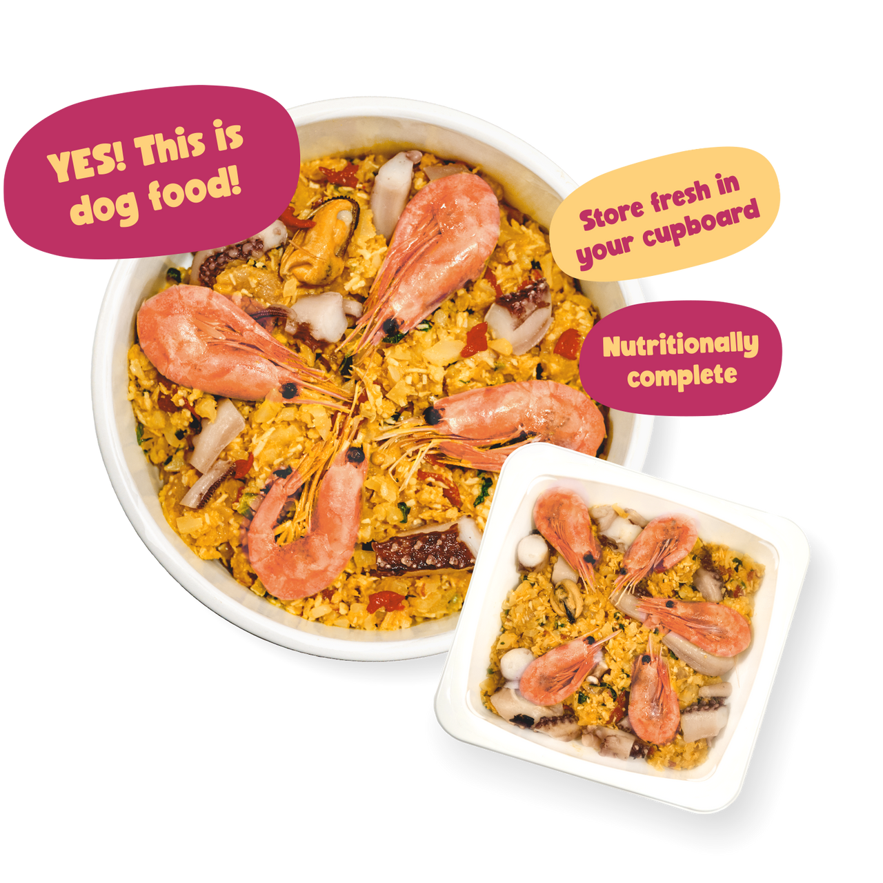 Skinless Chicken Leg 25%, King Prawn 14% (Crustacean), Cauliflower Rice 11.5%, Salmon 10% (Fish), Giant Squid Tentacles 10% (Mollusc), Piquillo Peppers 10%, Desiccated Coconut 10%, Yuca Flour 3.5%, Spinach 2%, Mussel 1.2% (Mollusc), Vitamins & Minerals 1.48%, Herbs and botanicals 1.01% (Turmeric, Saffron).